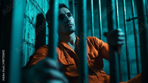 Man in an orange jumpsuit sitting behind bars in a dimly lit jail cell, illustrating themes of imprisonment and solitude.