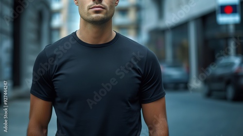 man, model, black, t-shirt, blurred, street, city, background, front view, closeup, cotton, advertisement, clothing, blank, bokeh, copy space, male, fashion