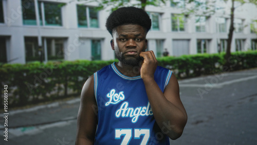 man, hand, touching, street, african, american, young, city, blue, basketball, discomfort, toothache, cheek, jersey, beard, afro, hedge, building, pavement, tree, male, grimace, pain, outdoors, urban, los, number, activewear, sidewalk, sport, team, casual attire, frown, gesture, expression, standing, looking, person, face, head, texture, fabric, print, emblem, detail, athletic, scowl