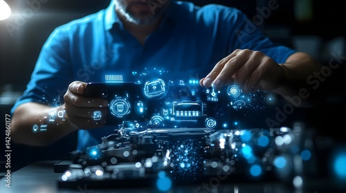 man, blue, shirt, holding, tablet, hologram, technology, display, digital, futuristic, innovation, sharpened, interaction, datum, visualisation, communication, design, screen, light, information, creative, modern, device, engineer, workplace, electronic, interface, connection, science, research, graphic, intelligent, advanced, virtual, concept, project, representation, industry, user, environment, system, mobile, application, workflow, three-dimensional, interactive