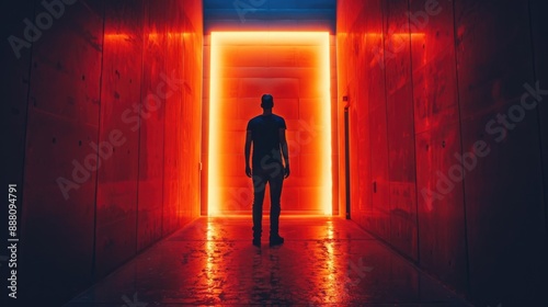 man, standing, dark, room, neon, light, glow, dim, shadow, mysterious, atmosphere, evening, late, night, deserted, isolated, alone, lonely, introspective, thinking, contemplating, solitude