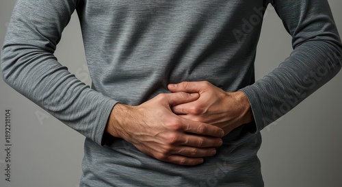 Man in gray shirt holding his stomach with both hands person holding stomach hands on abdomen