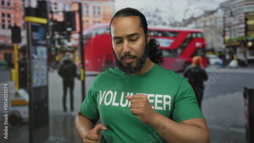 Man in green volunteer tshirt speaking and gesturing with hands on a busy city street near a red double decker bus and pedestrian crossing; community service earnest.