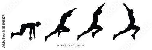 man, silhouette, motion, sequence, running, athlete, fitness, exercise, action, movement, speed, dynamic, athletic, sport, training, healthy lifestyle, jump, start, progress, graphic, illustration, black-and-white, isolated, white background, energy, power, determination, human, body