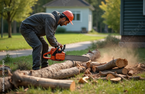 Man in orange helmet cuts fallen tree trunk with chainsaw. Sawdust flies around logs on grassy ground. Gardener works near houses, trimming branches.