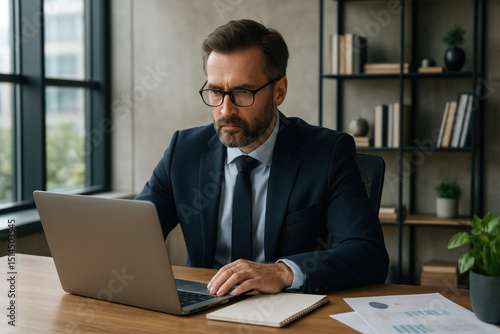 Man in suit and glasses working on laptop.
