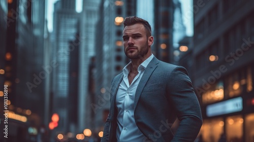 man, suit, city, street, urban, business, professional, portrait, city landscape, building, architecture, fashion, male, model, style, confident, serious, photogenic, modern, office, work, corporate, executive, businessman, formal, posh, elegant, dark, grey, white, shirt, attaching, jacket, hair, beard, look, standing, night, day, light, blur, background, sharpened, photo, candid, lifestyle