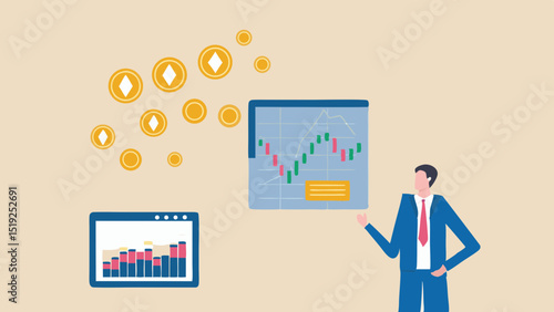 man, suit, financial, datum, chart, coin, business, presentation, setting, candleholder, graph, analysis, investment, growth, market, trend, economy, finance, currency, digital, asset, technology, crypto, trade, trading, investor, wealth, success, earning, profit, diagram, statistic, report, monitor, screen, display, corporate, professional, illustration, vector, with