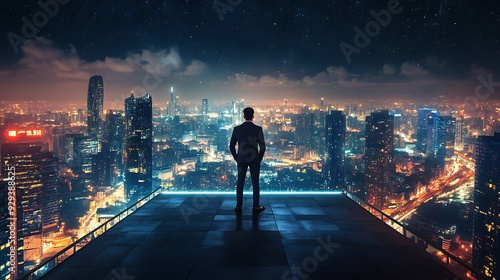 night, city landscape, rooftop, city, urban, business, man, suit, skyscraper, building, view, modern, skyline, landscape, star, sky, cloud, dark, light, success, achievement, dream, goal, future, ambition, hope
