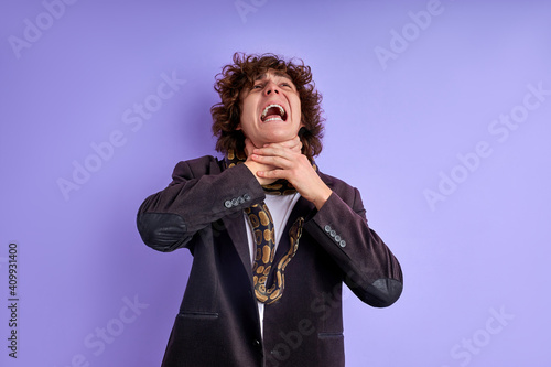 man in suit suffocates for lack of air because the snake suffocates him, dangerous exotic animal is not intended for being with humans
