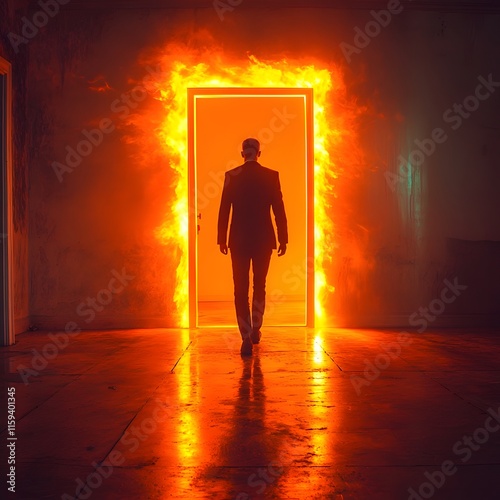 man, suit, door, light, dark, room, shadow, silhouette, motion, walk, enter, contrast, orange, glow, aethereal, atmosphere, drama, suspense, mystery, concept, digital, artwork, render, fantasy, surreal