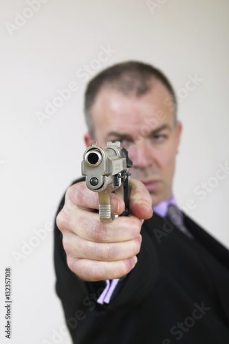 man in suit with gun