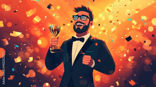 winner, award, celebrate, happy, success, trophy, achievement, confetti, goggles, tuxedo, smile, businessman, business, victory, champion, joy, event, triumph, celebration, grand, party, award, gala, elegant, formal, bright, gold, shining, spotlight
