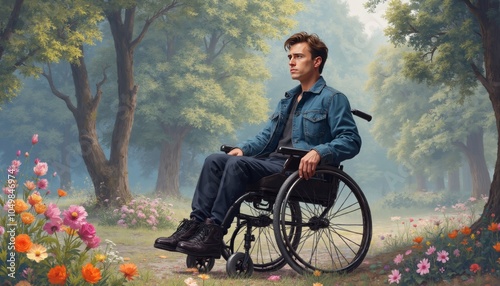 man, wheelchair, denim, jacket, park, landscape, nature, strength, contemplation, greenery, flower, sky, solitude, scene, environment, beauty, vibrant, confidence, warmth, colourful, atmosphere, thoughtful, armrest, control, comfortable, stylish, casual attire, serene, peaceful, moment, calmness, setting, scenery, individual, character, joy, life, human, engagement, surrounding, emotion, presence, life events, journey, resilience, calm, harmony