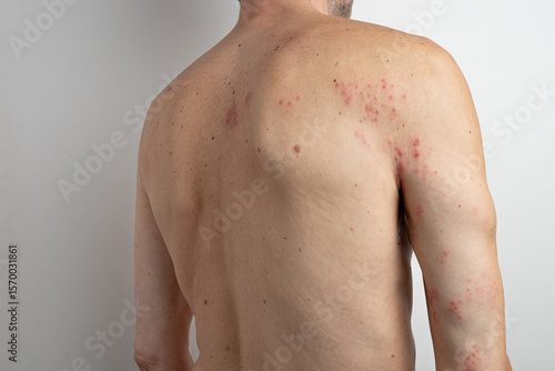 Man is displaying the effects of the herpes zoster virus, commonly known as shingles, with visible blisters and redness on his back and arm, a condition causing pain and discomfort