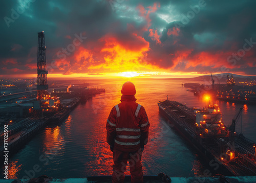 industrial, business, construction, engineer, person, helmet, oil, sunset, technology, man, professional, energy, power, men at work, gas, background, factory, occupation, safety, sea, sky, plant, equipment, work, orange, economy, crude oil, building, water, transportation, port, architect, contractor, silhouette, blue, shipping, crane, refinery, site, nature, builder, pollution, sunrise, male, cargo, production, manager, steel, asia