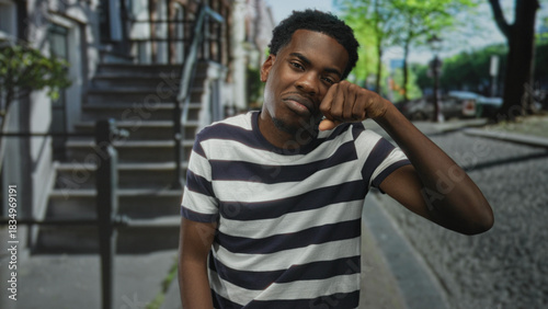 Man makes crying gesture with hand to eye on a quiet residential street wearing a striped shirt; sadness.