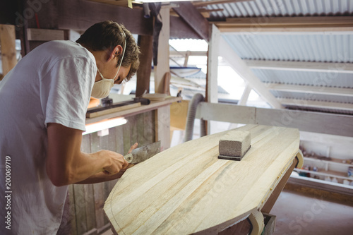 20s, young adult, man, male, caucasian, surfboard, industry, manufacturing, process, carpenter's shop, carpenter, professional, profession, occupation, work, skill, making, labor, men at work, expertise, wood, wooden, shape, shaping, sport, water sport, small business, mask, working, tool, edge, holding, accuracy, perfection, quality, concentration, attention, attentive, dedication, lifestyle