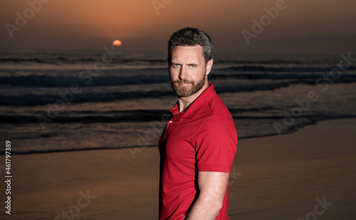 man portrait with beard in sunset over sea. unshaven guy on beach background.