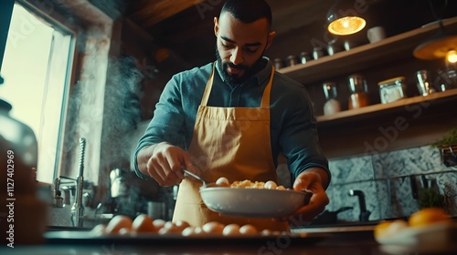 cooking, kitchen, man, ingredient, bowl, apron, cosy, morning, preparation, culinary, natural light, domestic, creativity, meal, home, rustic, wooden, food, chef, spice, countertop, steam, whipped, arrangement, receipe, artisanal, breakfast, pleasant, utensil, ambience, delicious, healthy, wholesome, fresh, favor, orange, joyful, calmness, culinary arts