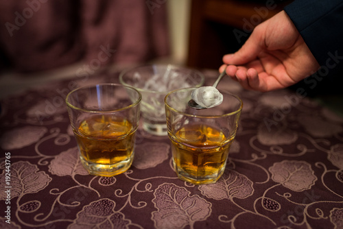 Man putting an ice cube in a glass of whiskey. Alcohol