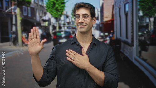 Man raising palm and placing other hand on chest in a pledge gesture on a busy street lined with shops and bicycles; sincerity honor.