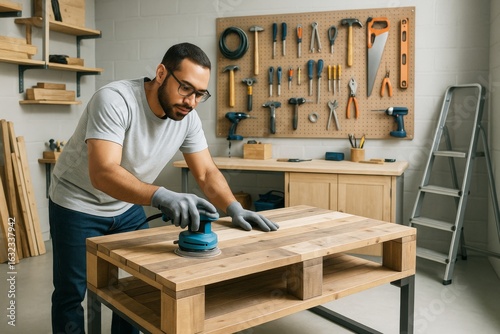 Man sanding wooden table in home workshop with various tools on wall, showing hobby and leisure activity in bright indoor background setting. Ai generative