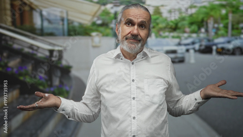 man, palm, shrug, street, outdoors, male, middle-aged, beard, long, hair, uncertainty, acceptance, doubt, hesitation, indecision, confusion, resignation, dilemma, questioning, car, stair, building, doorman, greenery, urban, city, shirt, white, grey, older, mature, ring, sidewalk, parking, entrance, pavement, solitary, puzzled, wonder, expression, gesture, hand, pensive, contemplation, ambivalence, bemused