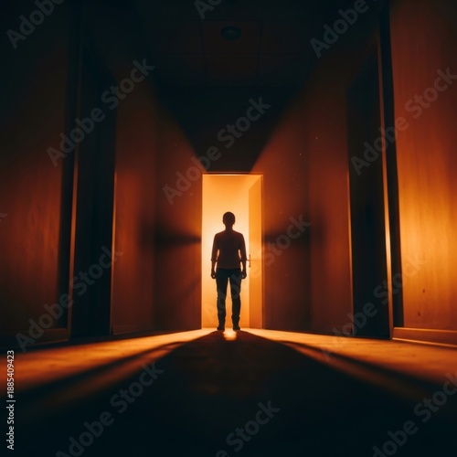 Man silhouette standing in doorway with bright light beyond in a dark hallway. Concept of choice, exit, mystery or danger.