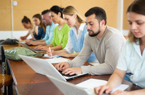Man sitting in classroom during lecture in university and using laptop.