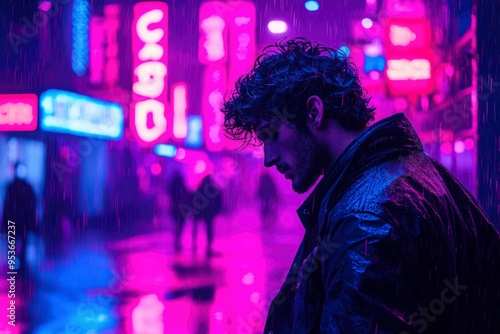 man, city, neon, rain, light, street, wet, dark, urban, night, standing, alone, silhouette, jacket, glow, blurred, background, purple, blue, pink, mood, gloomy, melancholy, sombre, vibe, atmosphere, cinematic, edgy, aesthetic, lonely, pensive, lost, street light, city landscape, anonymous