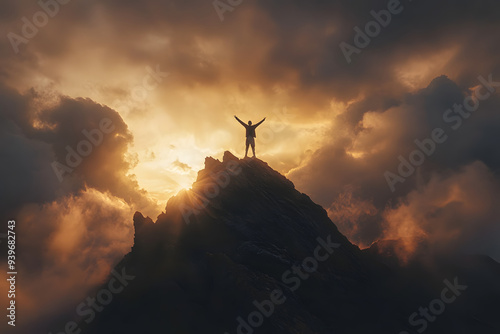Man standing on the top of a mountain with his arms out, Solitary goals and achievements, peace and happiness, success concept