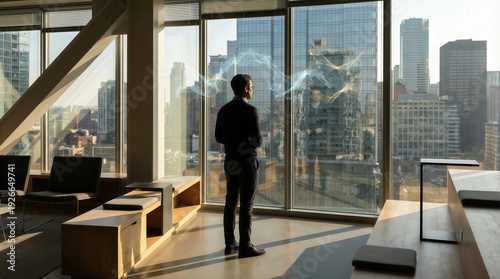 Man stands by a large sunlit office window, gazing at city skyline with digital wave visualization.