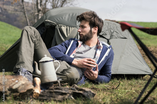 man, young, adult, caucasian, dog, canino, 1, animal, stroke, pet, domestic, lifestyle, togetherness, bond, balefire, smoke, kettle, landscape, outdoors, day, alone, people