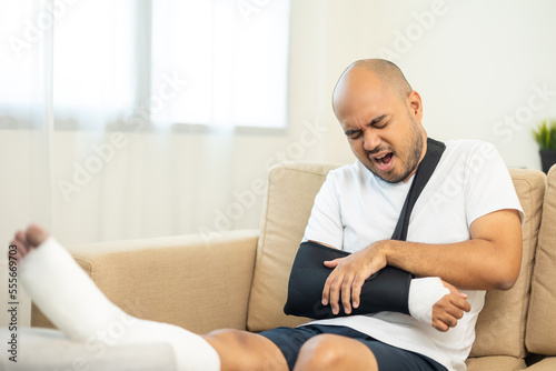 Man suffered pain from accident fracture broken bone injury with leg splints in cast neck splints collar arm splints sling support arm in living room. Social security and health insurance concept.