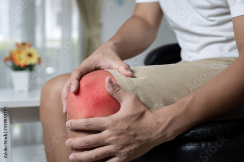 Man suffering from knee pain sitting on sofa.