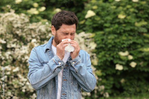 Man suffering from seasonal pollen allergy on spring day, space for text