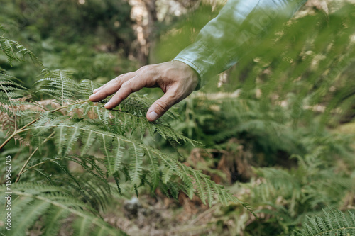 man, touching, green, plant, forest, environment, ecology, sustainability, copy space, 1, people, adult, spain, outdoors, day, casual attire, leisure, leaf, remote, hand, closeup, conservationist, fern, mid, care, caucasian, lifestyle, nature, growth, colours, male