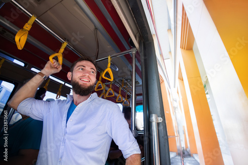 aerodrome, beard, bearded, bus, casual attire, caucasian, city, door, european, everyday, go, hand, handle, balustrade, happy, heading, hold, inside, life, male, man, modern, morning, moving, office worker, 1, passenger, people, person, public, ride, russian, safe, safety, shirt, smiling, standing, subway, train, tram, transit, transport, transportation, travel, urban, white, white-collar, work
