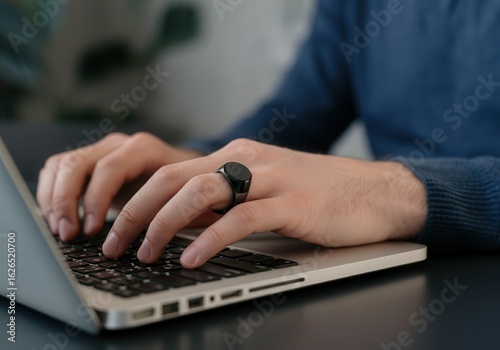 typing, laptop, smart, hand, ring, man, technology, work, office, business, keyboard, closeup, digital, male, sharpened, workplace, cyberspace, blue shirt, desk, professional, contraption, connection, indoor, modern, communication, data entry, caucasian, adult, relaxed, workspace, dark background, comfortable, casual attire, concentration