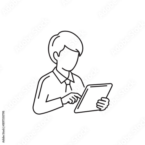Man using digital tablet in minimalist line art style with monochrome color scheme on white background for modern technology illustration