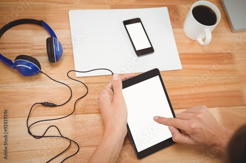 young adult, man, male, caucasian, smartphone, mobile phone, wireless technology, screen, office, wooden, blank, table, corporate, workplace, desk, holding, career, profession, professional, creative, occupation, hipster, businessman, business, beverage, black coffee, touching, cropped, part of, using, paper, touch screen, tablet, earphones, white, advertisement, indoor, copy space