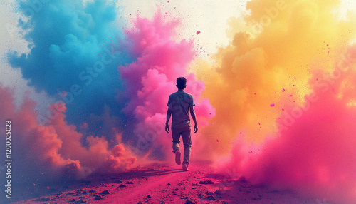 man, walking, colourful, cloud, explosion, outdoors, vibrant, pink, blue, yellow, artistic, surreal, dreamlike, smoke, creative, abstract, fantasy, male, one person, solitude, movement, journey, bright, rainbow, festival, dramatic, mood, inspiring, energy, atmosphere, unique, concept, silhouette, contemporary, bold, adventure, nature, freedom, imagination, young men, dynamic, high-coloured, aethereal, creativity