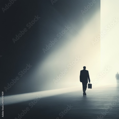 man, walking, light, shadow, silhouette, businessman, briefcase, door, future, hope, opportunity, success, growth, path, journey, direction, vision, ambition, motivation, aspiration, dream, goal, progress, transition, uncertainty, mystery, abstract, concept, background, texture, dark, bright, white, grey, grunge, monochrome, digital artwork, graphic, illustration, artwork, art, design, inspiration, wallpaper, poster, business, career, leadership, entrepreneur