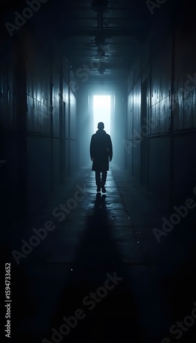 man, walking, light, dark, hallway, mystery, thriller, concept, image, silhouette, coat, tunnel, corridor, path, hope, escape, door, exit, shadow, fear, loneliness, isolation, depression, anxiety, moody, atmospheric, eerie, ominous, black, film, motion picture, scene, backlit, gloom, melancholy, despair, journey, adventure, quest, destination, future, unknown, portal, freedom