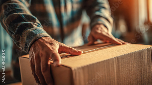 packing, shipping, delivery, cardboard, tape, hand, flannel, parcel, wrapping, sunlight, package, man, sealing, workspace, desk, preparation, home, men at work, manual, workstation, planning, male, transportation, courier, postal, transport, logistic, handle, casual attire, indoor, taping, casual clothes