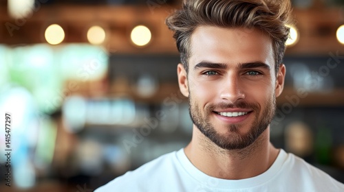 man, beard, smile, camera, wearing, white, portrait, standing, shirt, front, person, counter, adult, male, cheerful, young, happy, looking, photogenic, guy, positive, happiness, casual attire, confidence, head, attractive, lifestyle, face, head shot, 1, modern, caucasian, business, charming, friendly, hispanic, horizontal, 20s, trendy, indoor, background, toothy smile, photo, shoulder, joy, one person, carefree