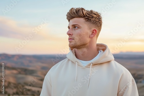 Man with a beard and short hair is wearing a white hoodie