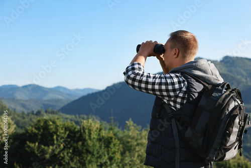 Man with backpack looking through binoculars in beautiful mountains, space for text