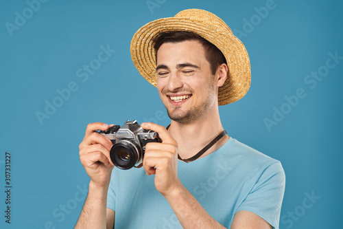 summer, background, isolated, young, male, man, photogenic, happy, studio, casual attire, people, hipster, person, travel, yellow, clothes, camera, lifestyle, adult, holiday maker, hand, cocktail, orange, smiling, photo, boy, drink, full, hat, style, mobile, soda, length, taking, cooler, box, phone, joy, food, mobile phone, holding, calm, bag, camping, cold, 1, selfie, walking, fashion, sunglasses